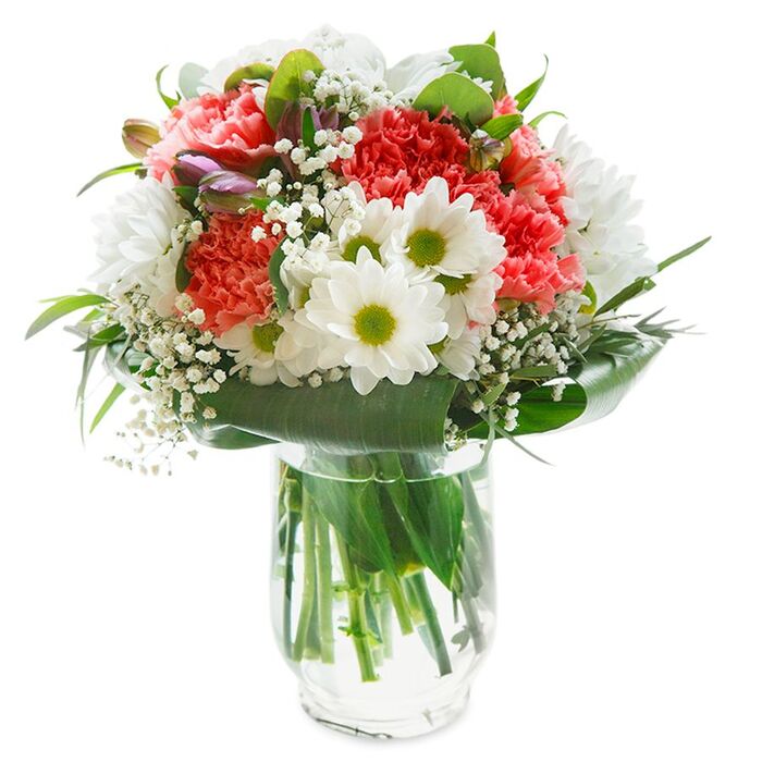 Infused with a sense of joy and renewal, this lush bouquet, nestled upright in an immaculate white gift bag, seems to gather the energy of spring mornings in Isleworth. Lively coral and striking red carnations, full and plush with ruffled petals, bring a touch of celebration to the display, as if echoing the blooming flowerbeds of Syon Lane. Bright white daisies, their golden-green centres gleaming, provide a crisp, cheerful contrast, suggesting optimism and the playful laughter of community gatherings along St John's Road. Wispy baby's breath, scattered delicately throughout, lends a gentle softness, lightening the whole ensemble-much like the calming presence of Isleworth's riverside paths. The addition of unopened buds tinged with purple on one side introduces an undertone of mystery and possibility, drawing the eye and inviting curiosity. Beneath it all, abundant deep green foliage with broad, shiny leaves supports and frames the arrangement, grounding it in lushness and vitality. Crafted into a perfectly rounded silhouette, the bouquet expresses not only freshness but genuine care and skill, as you'd expect from Isleworth's favourite flower specialists. The white gift bag, finished with wide satin ribbon handles and a discreet, stylish logo, promises both convenience and elegance for delivery or gifting. Photographed against a flawless white backdrop, the ensemble glows with a sense of clarity and hope-just the bouquet to say 'Congratulations,' mark a birthday, or send heartfelt wishes to someone special in Isleworth. This expertly constructed bouquet by Isleworth's local florists captures the uplifting spirit of springtime along the Thames-white daisies with sunny green centers bask among plush waves of coral-pink carnations, each ruffled petal crafted for just the right hint of softness and joy. Airy sprigs of baby's breath flow throughout the arrangement, their delicate blooms twinkling like starlight above Syon Park, and interlaced eucalyptus leaves add a gentle fragrance and calming, muted hue. Subtle buds of alstroemeria, streaked in rose and mauve, peep from the greenery, suggesting new beginnings in this harmonious, full-circle design. Every floral element is nestled in a cloud of varied greens that frame the bouquet with both order and abundance-much like the gardens and tree-lined streets of Isleworth itself. The palette glows with freshness, ideal for a birthday surprise, a heartfelt thank you, or simply brightening a loved one's morning in Old Isleworth or along London Road. This arrangement overflows with cheerful energy and a sense of renewal, expressing a commitment to local craftsmanship and floral artistry. Each blossom speaks to a moment of celebration, expertly curated to bring joy and comfort throughout the neighbourhood. This bouquet, styled by expert Isleworth florists, radiates cheerful grace and easy sophistication-like a fresh breeze in Old Isleworth Market. The core is made up of plush, ruffled coral carnations, their vibrant hue and tactile petals brimming with personality and joyful movement. Clustered around them, snowy white daisies with vivid yellow-lime centres gaze upward, exuding purity and a sense of happy optimism found in the gardens on Twickenham Road. Gentle sprays of tiny white baby's breath float amid the larger blooms, creating a misty softness that lightens the arrangement's silhouette. Glossy, dark green leaves cradle the bouquet, their broad expanse and subtle shine echoing the lushness of Isleworth's nearby green spaces. Here and there, unopened magenta alstroemeria buds peep through, hinting at coming beauty and offering depth in both form and colour. The bouquet is set within a classic, clear glass vase, with freshly cut stems visible through the sparkling water-a testament to the arrangement's local freshness and careful preparation. Illuminated in bright, even light against a flawless white background, every bloom and leaf seems to glow with positive energy. This uplifting composition, perfect for birthdays, new beginnings, or sending thanks, brings a piece of Isleworth's nurture and natural beauty into any home, sharing its gentle fragrance and vibrant spirit.